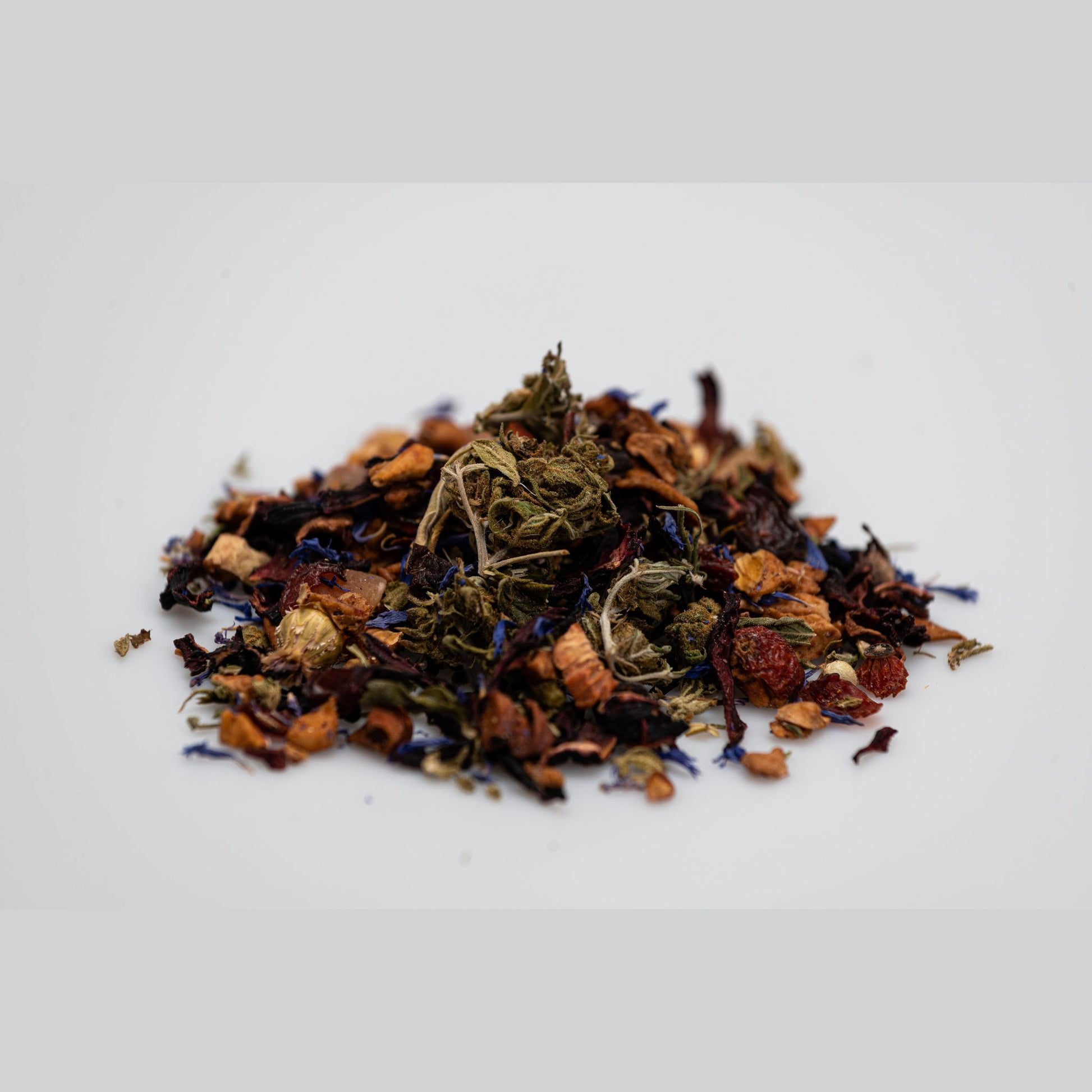 Sastav: dinja, jabuka, papaja, breskva, ananas, šipak, cvijet plavog različka, list Cannabis sative (sorte Kompolti, Silvana, Finola)